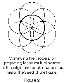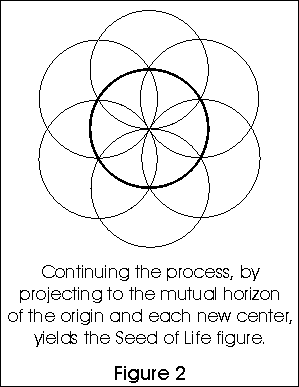 Going on from the point of origin, one might get the idea of moving to the perimeter of the circle (the observational horizon) and looking around again. Sacred Geometry suggests that this is exactly what happened next. We have one extent, one step taken by the One, and one more arc of observation, at this point. The form we can describe is the line connecting the points, the circular arc about each point, and the Vesica Piscis (fish-like shape), where the two circles overlap [see Figure 1]. If we generalize this process of moving to the periphery, and then observing another continuous arc, we form a ring of circles about the original circle, and create a figure known as the Seed of Life [Figure 2]. This is very significant, because it is at this stage that the One begins to develop a sense of proportion through an additive process which yields a knowledge of multiplicity. It also is when the continuity, or completeness, of the circle is verifiably realized, for the first time. This concept of verifiability is utterly important to understanding the significance of this process. What we are looking at is a situation where, in the beginning, the One Being had no frame of reference whatsoever (being aware only that it was conscious) and It needed to evolve one before the remainder of form could come into existence. The question remains of why this is relevant to the state of the universe today. What I suggest is that the explorations of the One (or the awakening and development of consciousness) actually resulted in the geometry of dimensionality itself, and that unseen dimensions existing before the advent of form as we know it, created our reality.