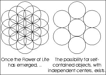 At this point, the One Being moves to its horizon, taking a step and moving one extent from the origin. From this new vantage point It could see back to where It started, and It proceeded as-if this new point was the origin, making another complete arc of observation. From here, Sacred Geometry suggests that Spirit extended Itself again, projecting to a point on the horizon of both the original and new center, and then repeated this act until it had come full-circle, creating the Seed of Life figure. This is seen as an Additive process, whereby the One is generalizing on basic concepts and principles. The opening figure exists in a 0-dimensional space, and we would say it is a point (having zero size), but its size is actually indefinite or immeasurable. As discussed previously, in the realm of the zero-brane there is an infinite number of virtual dimensions, or an infinite extent to the zero dimensions, because such is the nature of non-commutative geometry. This being so, our solitary circle could also be infinite. The question all of this brings to bear is "How does normal geometry arise from a non-commutative space?" We could also ask "How does a measurable extent first become possible?," and get many of the same answers. The reason for this is that non-commutative geometry precludes measurement by violating the laws of normal Arithmetic (specifically the Commutative Law). The fact that things "don't add up" makes it impossible to establish a point of reference from which to make a comparison. This is precisely what makes the Ancient knowledge of the Seed of Life and its progeny so significant.