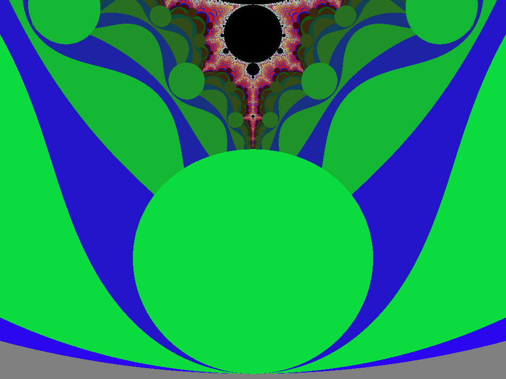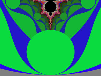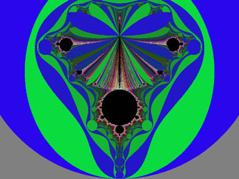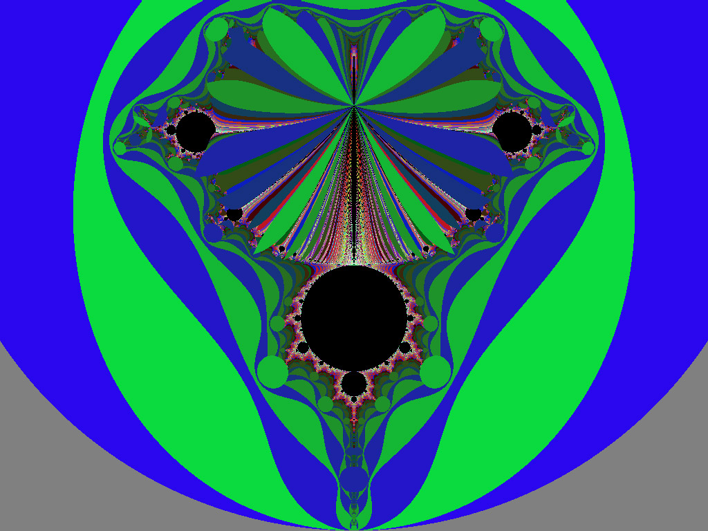 This largest circular form is recessed especially far from the edge of the repeller sets out on the spike, at the extreme. The edge of the disc is flush with the edge of the Set so that it just obscures the final extent of the spike itself, and meets the repeller sets at the far end. As with the other circular objects, it is at a favorable energy level with respect to its surroundings. In other words, it requires fewer calculations and less energy to resolve, or maintain, this form than those areas of the repeller sets which it overlies, or the Set itself. It is exceptional, however, in that it completely obscures the spike, and all of the other circular forms around the periphery leave a small region of the higher-iterated areas exposed on the side away from the edge of the M-set. So; it would seem that we are cut off from some kinds of knowledge, either by nature, or by what our calculational process has revealed. Or are we?