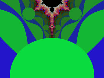 When a star is extremely large, there is a good chance that it will become something called a Black Hole. If there is enough mass left after a large star has gone supernova, scientists believe it must become one of these. This entity is virtually gravity incarnate, since it has no physical substance whatsoever, only mass, volume, and spin (plus, perhaps a magnetic or electric charge). Even light is drawn into the heart of a Black Hole, since it cannot escape the event-horizon of its outer edge. The gravitational effect of these objects is so great that anything coming close enough to feel its tug will eventually be pulled in. This phenomenon is mirrored by the activity taking place on the far end of the Mandelbrot Set, and the Fractal Butterfly figure derived from it. We see that both the particle-like aspect (circular forms in butterfly figure) and the wave-like aspect (waves in the repeller sets) appear to be drawn into the gravity well at the figure's base.