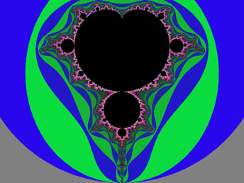 The appearance of the largest disc seems to depict the ability of the gravitational force to swallow, or contain, vibrations which would otherwise emanate from an object, and the near-absolute containment of energies by a black hole. The event-horizon, or containing edge, of a black hole hides the information, or the energies, of what is inside escape to be seen in the outside world. What is hidden is not necessarily unknowable, however, and the Mandelbrot Set may give us a way to see it. If this theory proves valid (or informatively relates to our world) we have the ability to model these things on a home computer, and strip away the layers of form (including the various circular areas, representing particles) to see what is underneath each. We can peer into the background, seeing the patterns of formation which give rise to form, or see the objects and forms which would exist if the forms we know did not. In this area of the M-set, we can see the relative movement of forces behind the impenetrable barrier of the event-horizon of a black hole. Perhaps the secrets of gravity, which would lie behind this barier, are now in our grasp.