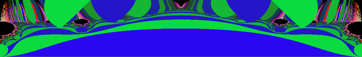 In most parts of the Set, only very tiny waves are anywhere near the edge of the figure, which lies inside all of the color bands. Near the cusp, at (0.25, 0i), the fine detail of local features requires enormous numbers of calculations to resolve, and the waves in the repeller sets (of the innermost color bands) are very tiny indeed. Near the tip, at (-2, 0i), however, all of the longer waves in the repeller sets converge, and meet up with the shorter waves. Even the color bands requiring the fewest calculations to resolve touch the Mandelbrot Set itself at the very tip. It appears as if the waves which emanate from the end nearest the cusp are being absorbed by the structures on the opposite end of the figure. In the tail, near the tip, you can find the largest of all the miniature Mandelbrot figures. If you overlay the form of the Fractal Butterfly, you find that the largest of all the circular figures is centered about this feature. This seems especially significant to me, and I will explain why later.